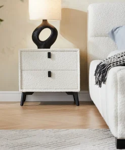 This nightstand features a chic boucle fabric design. adding a soft. textured touch to your bedroom. The creamy color palette complements its minimalist modern style. making it a perfect addition to contemporary interiors. With a practical double-drawer design. it offers ample storage space while maintaining a sleek. elevated look thanks to its high legs. A beautiful blend of form and function. this nightstand brings both style and convenience to your space.